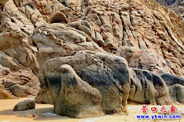 在營口市蓋州北海的大海邊,有一個國家級海蝕地貌地址公園。這是經(jīng)過十八億年大自然的鬼斧神工而造就的神奇景觀。在綿延兩千多米的海岸線上,岸邊的巖石由于海水的沖刷和風(fēng)雨侵蝕,而形成了各種各樣、千奇百怪的形態(tài)。如金龜出洞、大士聽潮、大象歸山、雄獅鎮(zhèn)海、龍首賜福、夫妻石等眾多唯妙唯俏的單體景觀。人們俗稱此處為“龍宮一條街”。