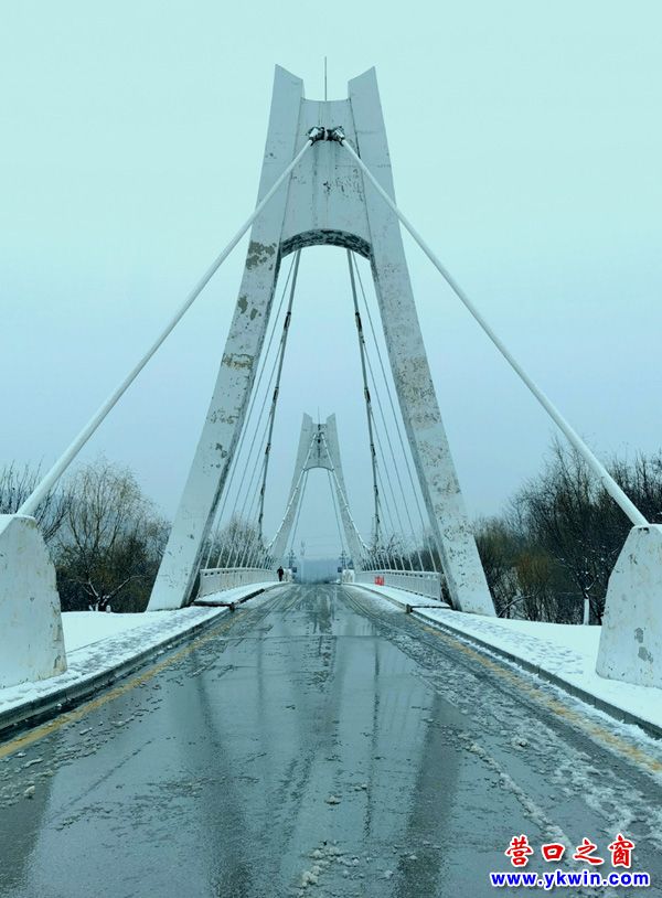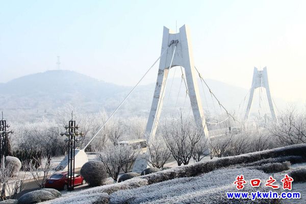 霧凇朦朧下的懸索大橋。題聯(lián):