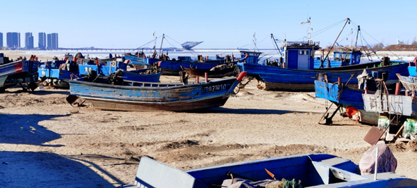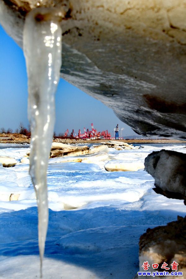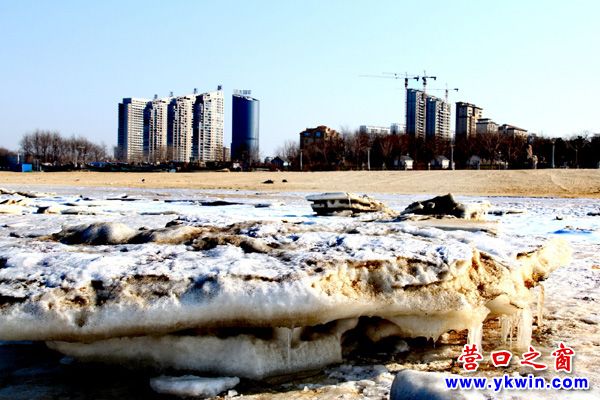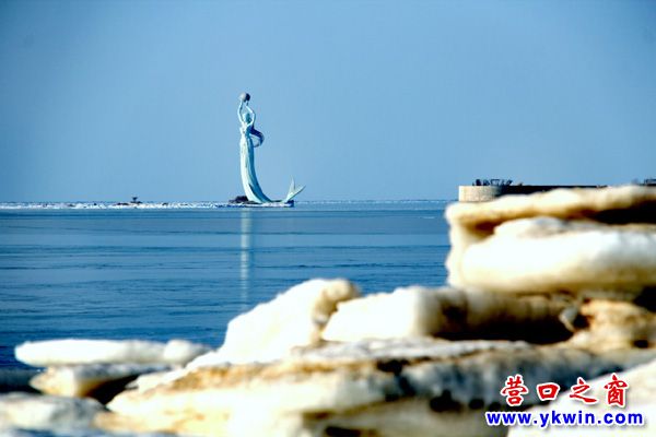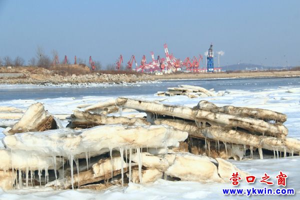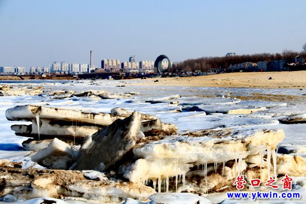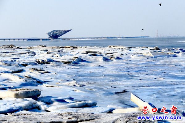 水岸相接處,冰排乍起,層層疊疊,千姿百態(tài)。向前,冰封似鏡,一覽無余。稍遠,大海茫茫,無邊無際。停泊在錨地的一艘艘巨大貨輪,從岸邊望去,好似在海上建起的城市;叫不上名字的海鳥不時在海天間掠過。北望營口港巨輪傍岸,一排排岸吊長臂揮舞;南觀山海廣場的觀景塔雄霸海上,渾然大氣;相距不遠的鲅魚公主亭亭玉立,安然祥和。