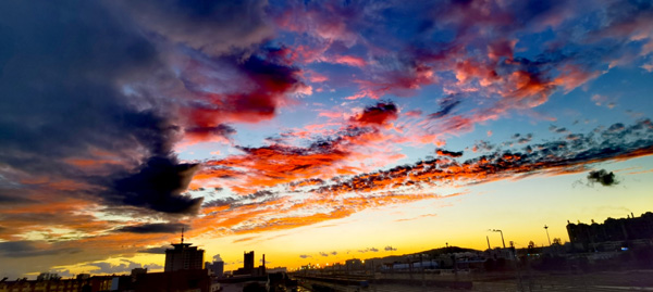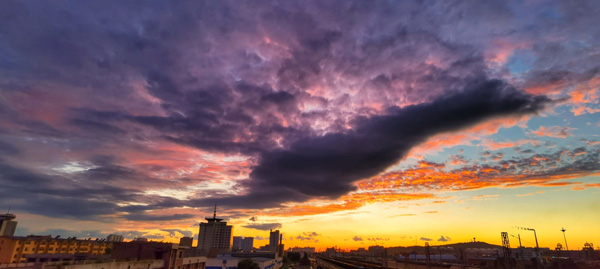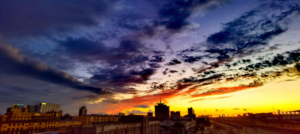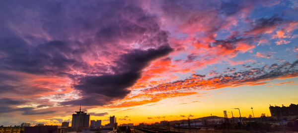 昨天的天氣,一整天都是陰沉沉的,不時(shí)還下起了雨。傍晚六點(diǎn)二十分左右,西邊天上厚厚的烏云,逐漸薄了起來。突然間裂開了幾道縫隙,金色的夕陽光,強(qiáng)行從縫隙中透出,仿佛在傳遞著某種信息。六點(diǎn)三十分,意想不到的晚霞出現(xiàn)了。越來越美,而且是越來越意想不到的美。云,白色、紫色、金色、紅色……,千變?nèi)f化;圖案,龍、鳳、海豚、飛天、人物、珊瑚、彩練……,似是而非。風(fēng)吹云走,瞬息萬變。光移影動,令人遐想。