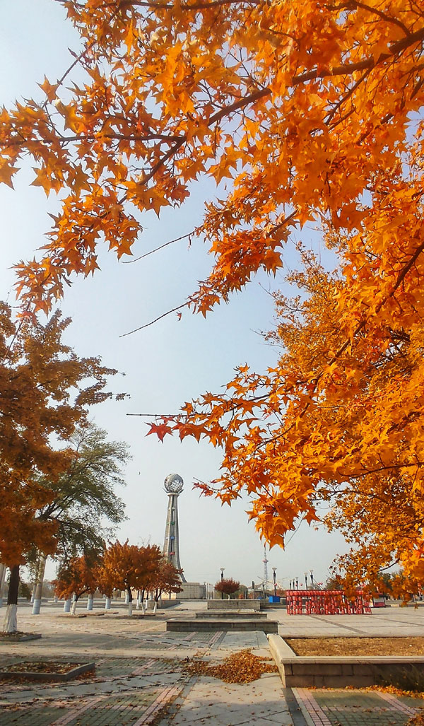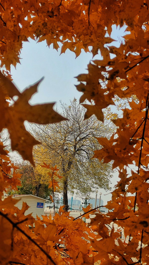 走進明湖廣場,映入眼簾的是那一排排高大的五角楓,它們像是被大自然這位神奇的畫師打翻了調(diào)色盤,葉片從原本的綠色變成了絢麗的紅色和金黃色。每一片楓葉都像是一團燃燒的火焰,在陽光的照耀下閃爍著迷人的光芒。微風(fēng)吹過,楓葉沙沙作響,仿佛在訴說著秋天的故事。 陽光透過樹葉的縫隙灑下來,地上便布滿了星星點點的光斑,宛如一幅金色的地毯。偶爾有幾片楓葉飄落,它們在空中打著旋兒,像是一只只翩翩起舞的蝴蝶,輕輕地落在地上,把大地鋪成一片金黃。