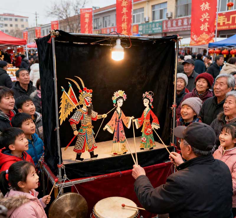 鑼鼓聲漸急,絲弦聲輕揚,燈光穿過后臺,將影人映在幕布之上。武將身披鱗甲,靠旗飛揚;旦角鬢簪珠花,蓮步輕移。藝人指尖捻動簽桿,影人便活了起來,舉手投足間,盡是戲曲的韻味。“鏘鏘”的鑼鼓點里,楊家將的忠勇,花木蘭的剛毅,一段段故事從燈影里流淌而出。孩子們看得入了迷,小嘴巴微微張著,目光緊緊追著幕布上靈動的身影;老人們則聽得親切,跟著調(diào)子熟悉的輕輕哼唱,眼角的皺紋里,漾著的是童年的記憶和滿臉笑。