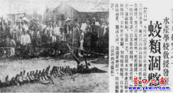 1934年8月8日,濱城營口發(fā)生了一件震驚東北的大事件,一農(nóng)民在營口河北東小街附近之葦塘中竟然發(fā)現(xiàn)一體長三丈多,有角兩只,各四尺長的“巨龍”,隨即向警察署報告。警察署接到報告后,第六警察分署署長率人前往現(xiàn)場。隨后,在警察的監(jiān)視下,“巨龍”遺骨被運到營口西海關(guān)碼頭,然后在西海關(guān)門前展出。營口市民聽說營口“天龍降”后,紛紛前來一飽眼福,當(dāng)時“觀者塞途”。面對接踵而來的觀者,當(dāng)局只好派出三名警察維持秩序,僅次日就有2000余人參觀??春螅腥私哉J(rèn)為此物為“龍”之骨。營口水產(chǎn)高級中學(xué)校張教授認(rèn)定此物為“蛟類”(蛟龍,《現(xiàn)代漢語詞典》的解釋為:“古代傳說中所說興風(fēng)作浪、能發(fā)洪水的龍”)。當(dāng)時,《盛京時報》先后以“天龍降”、“巨龍”、“營川墜龍”、“龍骨由縣發(fā)給師校作為標(biāo)本”、“龍降釀災(zāi)”等為題連續(xù)報道了此事。隨后,東北各地前來營口觀“龍”者絡(luò)繹不絕,開往營口的火車票價也作了上浮。一時間,營口游人如織,觀者如潮。當(dāng)時營口的“美大”和“英明”兩家照相館將展出的“龍骨”拍成照片,沿街叫賣,很多外地觀者為了讓家人也能一睹“龍”容,紛紛購買“龍”照,帶回故里。后來,該“龍骨”標(biāo)本由營口縣(即營口市)公署轉(zhuǎn)交給位于通惠門街的縣立師范南校作為動物標(biāo)本,以為研究生理學(xué)之用。