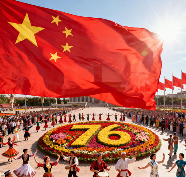 今朝慶典,四海同歡,喜氣盈霄;此日歡歌,九州共樂,豪情涌潮。