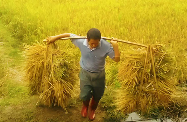 注:平水韻押陽韻。一肩新月指被兩筐新稻壓得肩上扁擔(dān)挑就像一彎半月一般。