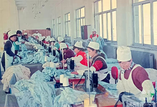 女工們正在對(duì)床單進(jìn)行鎖邊加工,完成最后一道工序。