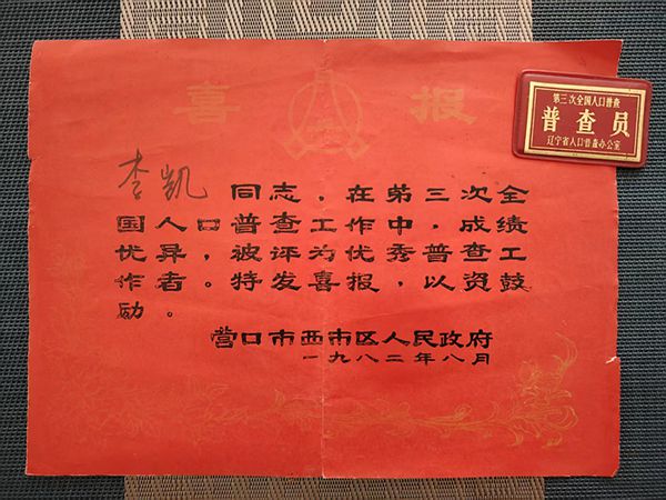 因工作表現(xiàn)突出,我被營口市西市區(qū)政府評為“優(yōu)秀普查工作者”,還榮立廠三等功。如今43載春秋悄然逝去。昔日的喜報成了時光的標本,像一片被歲月風干的楓葉,與我的退休證相伴,它記錄著1982年,我第一次將個人命運與國家敘事,鄭重地釘在一起。(李凱)