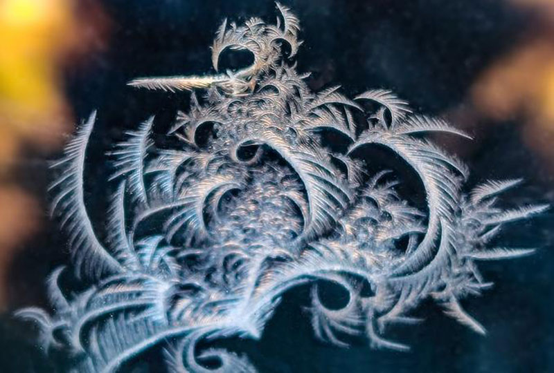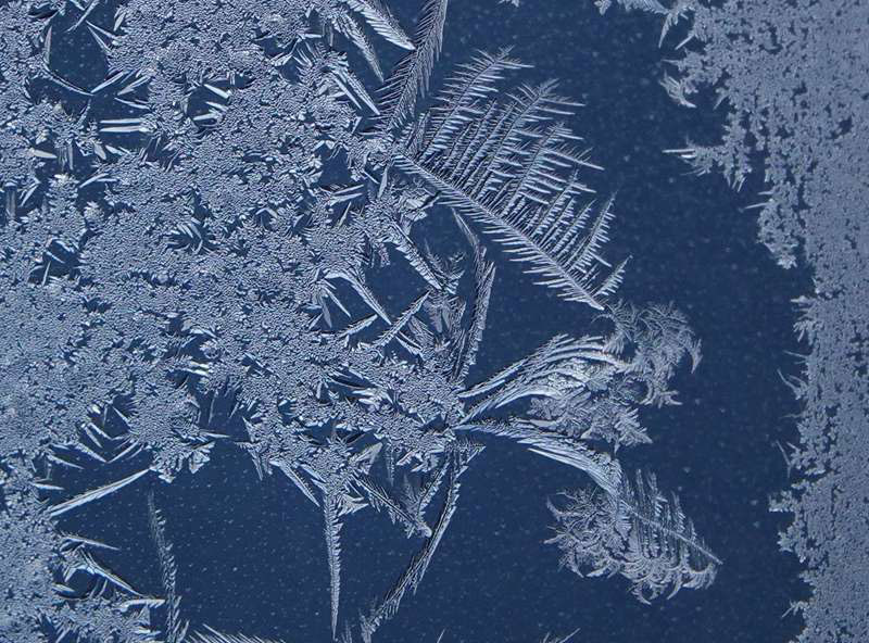 后記:冬夜室外氣溫很低,而室內(nèi)氣溫高,空氣中會(huì)有大量水蒸氣,當(dāng)水蒸氣遇到溫度在0℃以下的玻璃時(shí),放出熱量,在玻璃的內(nèi)表面直接凝華成冰晶。由于玻璃表面的情況不同,有的光滑,有的毛糙,有的積有污垢,有的一塵不染,當(dāng)冰晶向四周延伸時(shí)就形成了各式各樣的花紋,這就是我們看到的“冰花”。