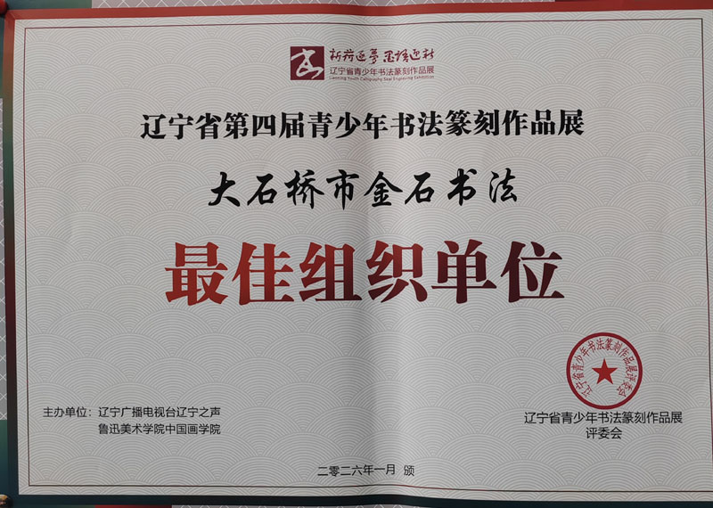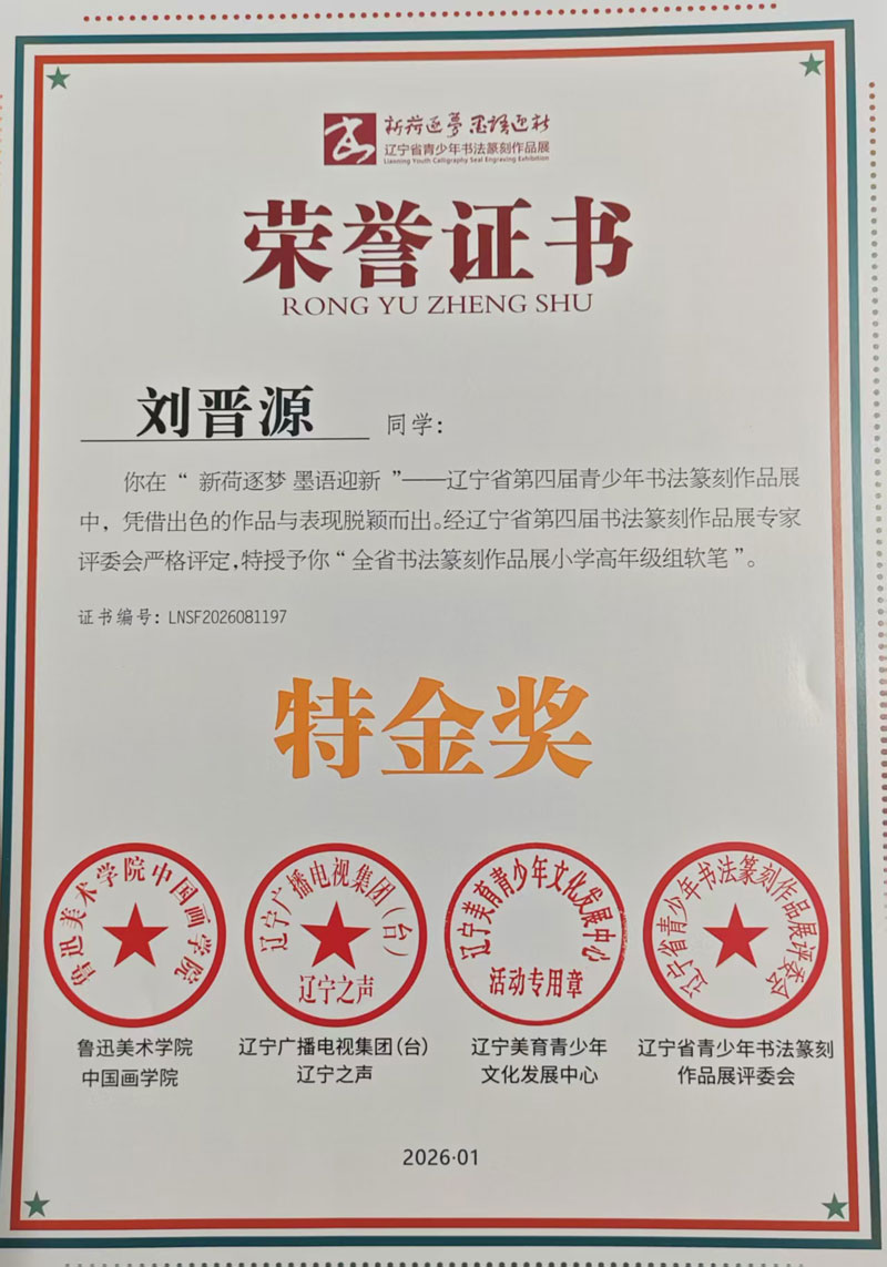 大石橋市金石書(shū)法培訓(xùn)中心劉晉源書(shū)法作品在遼寧省第四屆青少年書(shū)法篆刻展中榮獲特金獎(jiǎng)。