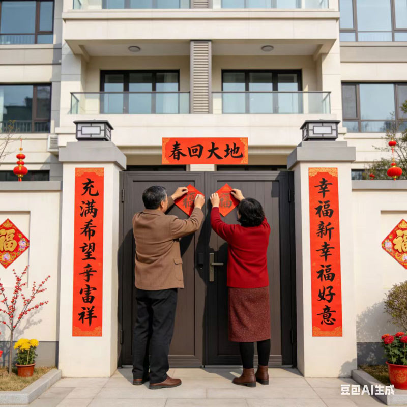 臘月廿九,貼聯(lián)迎春,營川街巷,紅霞盈門。遼河凝瑞,紅紙裁勻;渤海聚祥,墨汁研醇。看超市賣場人群熙攘。更有文人墨客,揮毫走云,楷隸行草,各展風(fēng)神;樓道門前,翁媼貼聯(lián)循倫,左昭右穆,吉語喜瑞盈門。廟觀黃聯(lián),祈四時康泰;民宅紅對,祝五谷豐屯。上聯(lián)書吉,字字凝暖喚春;下聯(lián)題安,行行納福藏珍。橫批點睛,收盡新春佳話;福字貼門,迎福入門嘉宸。窗粘窗花,紅燈相映;門懸春聯(lián),年味滿營垠。