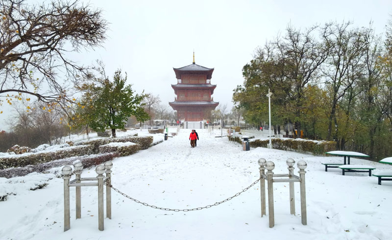 漫天雪花飄舞,簌簌落到青龍山公園。放眼望去,山前廣場鋪就白毯,牌坊的飛檐堆起厚雪,上山的石階嵌著一溜銀白。松槐凝霜似梨花盛開,柳絲垂著細(xì)碎冰晶隨風(fēng)輕晃。觀景塔尖不時(shí)有雪團(tuán)滾落,懸索大橋橫臥成一道素練。人們踏著積雪或向山而上,或傾情欣賞北國風(fēng)光。風(fēng)掠過,抖落滿樹碎瓊,天地清寂,滿目潔白。