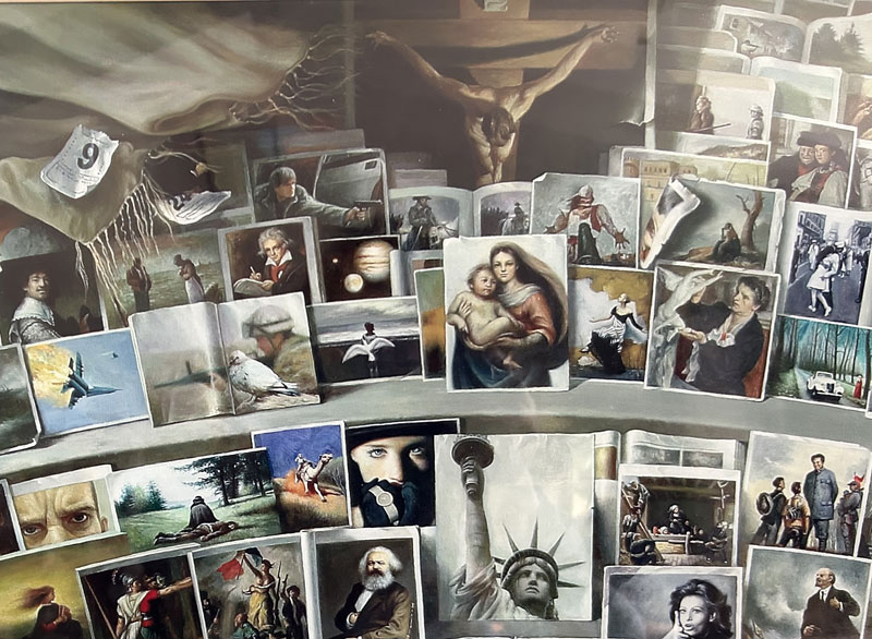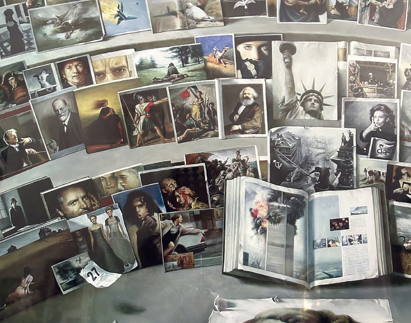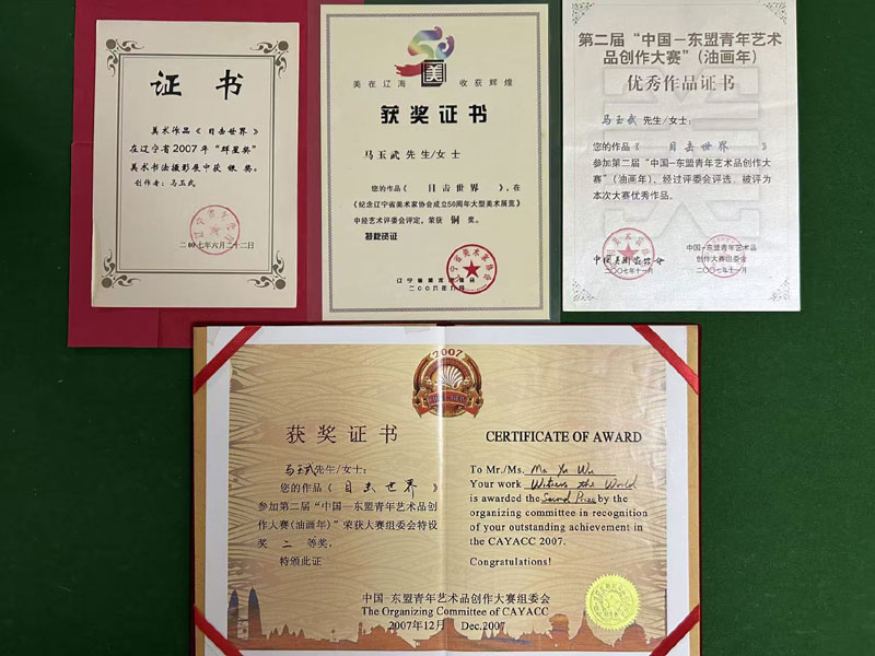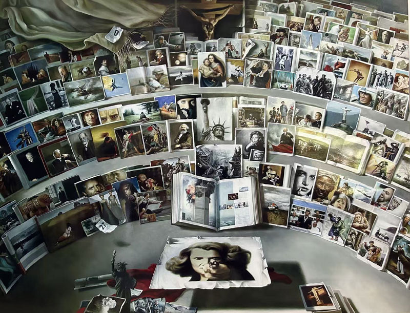 馬玉武油畫作品一一《目擊世界》作于2004至2005年,作品通過不同的歷史瞬間,以人類命運(yùn)為主題,用精準(zhǔn)的造型定格了上百個歷史瞬間,表達(dá)了近現(xiàn)代以來愛痛交織的人類心路歷程。該作品曾榮獲《紀(jì)念遼寧省美術(shù)家協(xié)會成立50周年》大型美展,榮獲銅獎,遼寧省《群星獎》獲銀獎,榮獲由中國美術(shù)家協(xié)會舉辦的《第二屆中國一一東盟藝術(shù)品創(chuàng)作大賽》獲組委會二等獎,被南寧博物館永久收藏。
