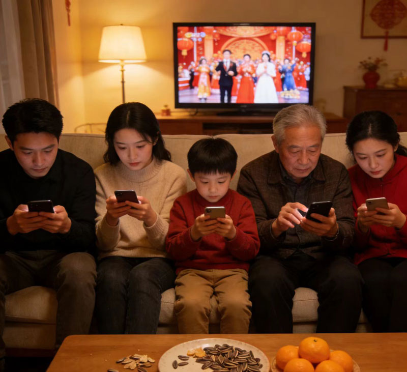 現(xiàn)代人過(guò)春節(jié),比前幾年新事可多多了。電視里各個(gè)臺(tái)的春節(jié)晚會(huì)的熱鬧聲像往常一樣流淌著。不過(guò)比起屏幕里的歌舞,我們一家人更專(zhuān)注地盯著手里的方寸熒屏——手指懸在屏幕上方,像隨時(shí)準(zhǔn)備捕食的獵手。