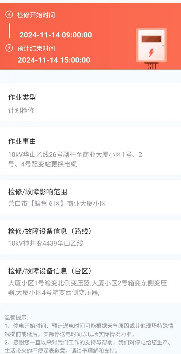 2024年11月14日 鲅魚圈區(qū)電網(wǎng)檢修公告 |