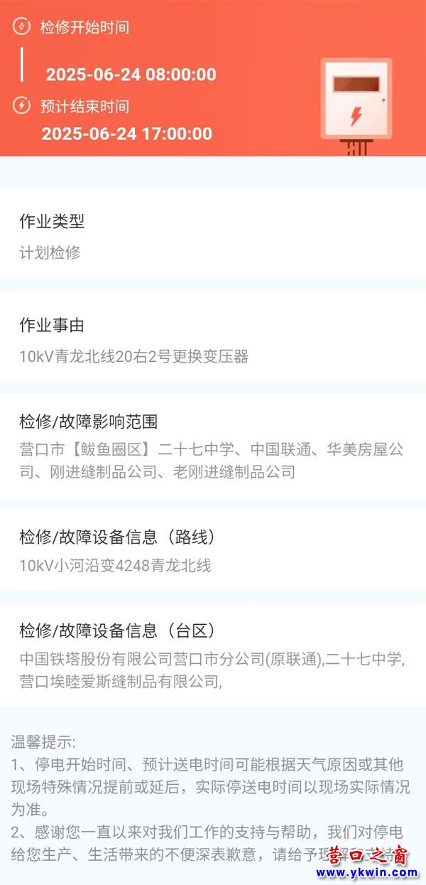 2025年06月24日 鲅魚圈區(qū)電網(wǎng)檢修公告 |