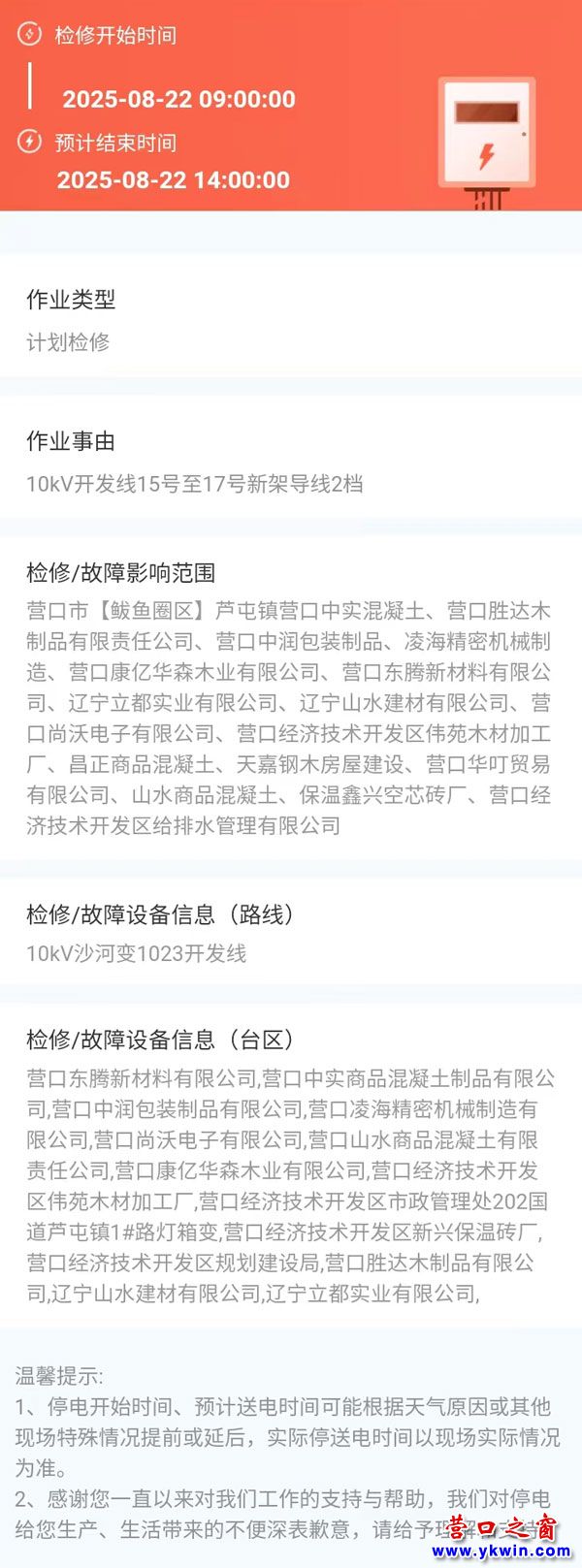 2025年08月22日 鲅魚(yú)圈區(qū)電網(wǎng)檢修公告 |