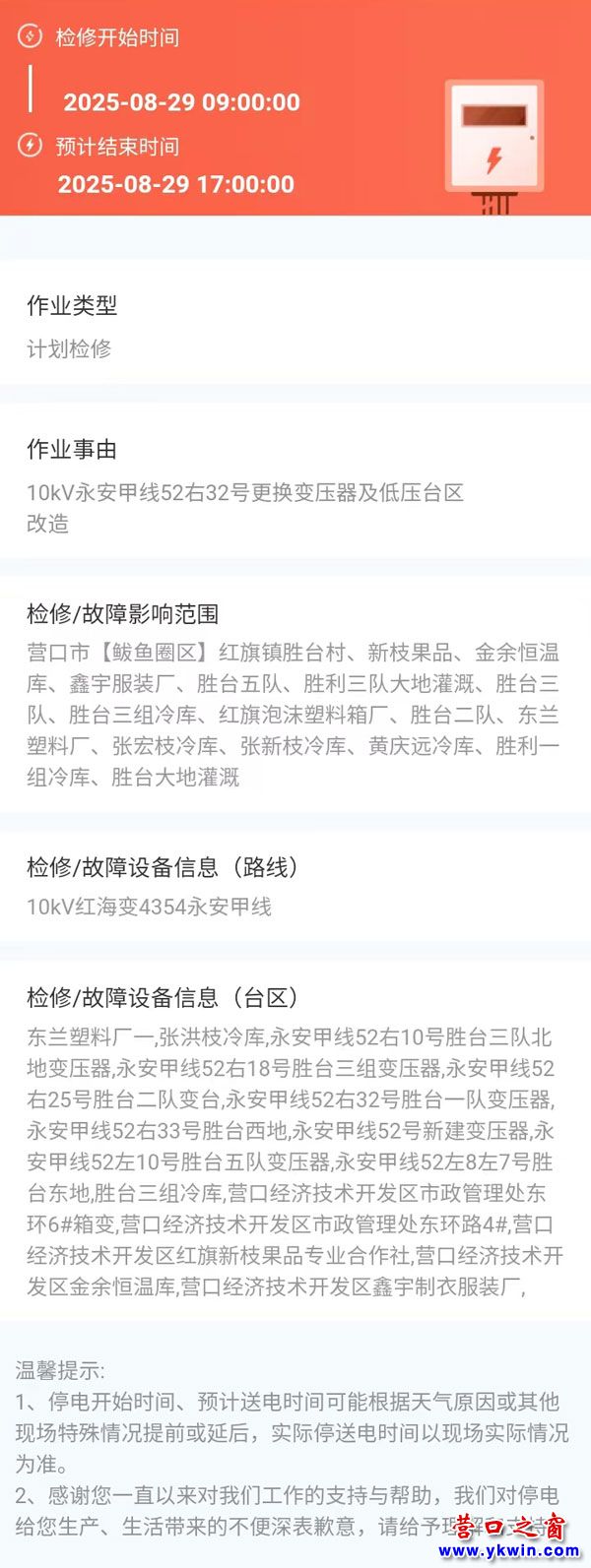 2025年08月29日 鲅魚圈區(qū)電網檢修公告 |