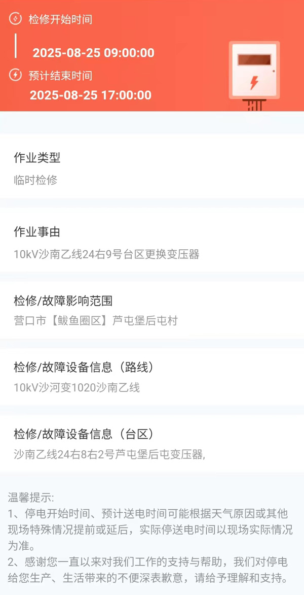 2025年08月25日 鲅魚圈區(qū)電網(wǎng)檢修公告 |
