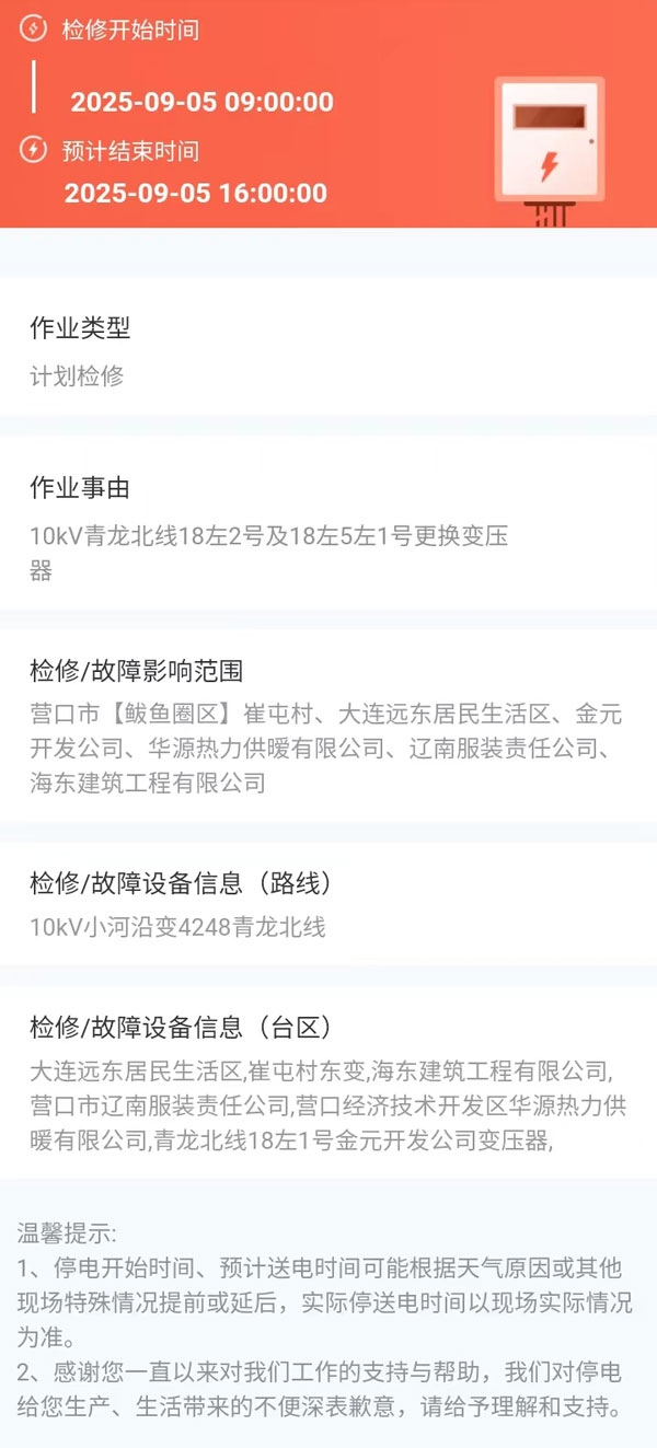 2025年09月05日 鲅魚(yú)圈區(qū)電網(wǎng)檢修公告 |