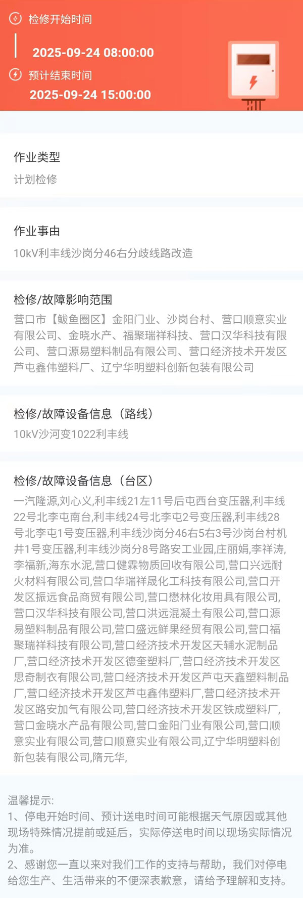 2025年09月24日 鲅魚圈區(qū)電網(wǎng)檢修公告 |