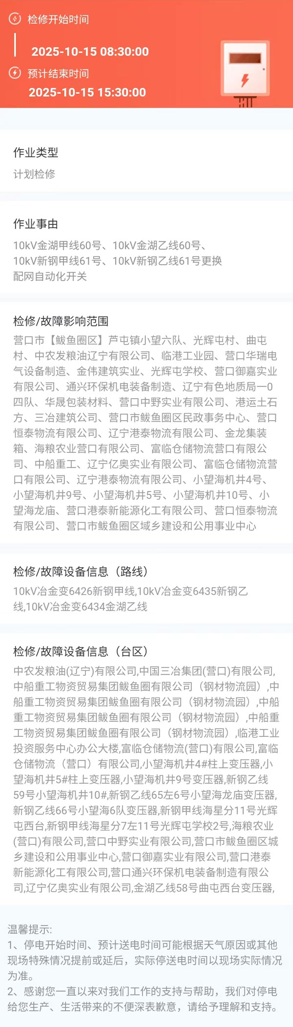 2025年10月15日 鲅魚圈區(qū)電網(wǎng)檢修公告 |