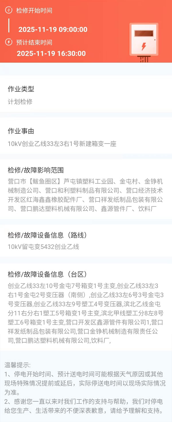 2025年11月19日 鲅魚圈區(qū)電網(wǎng)檢修公告 |