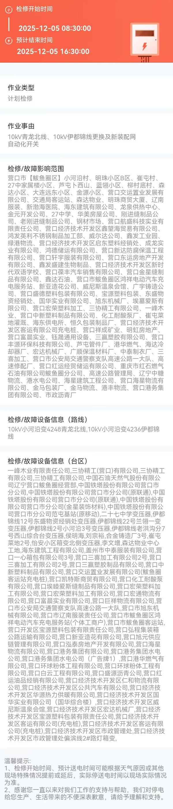 2025年12月05日 鲅魚圈區(qū)電網檢修公告 |