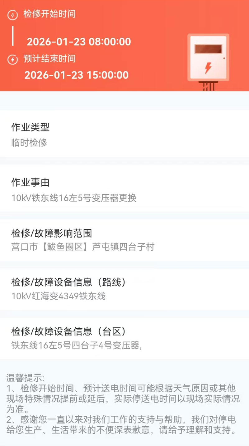 2026年01月23日 鲅魚(yú)圈區(qū)電網(wǎng)檢修公告 |