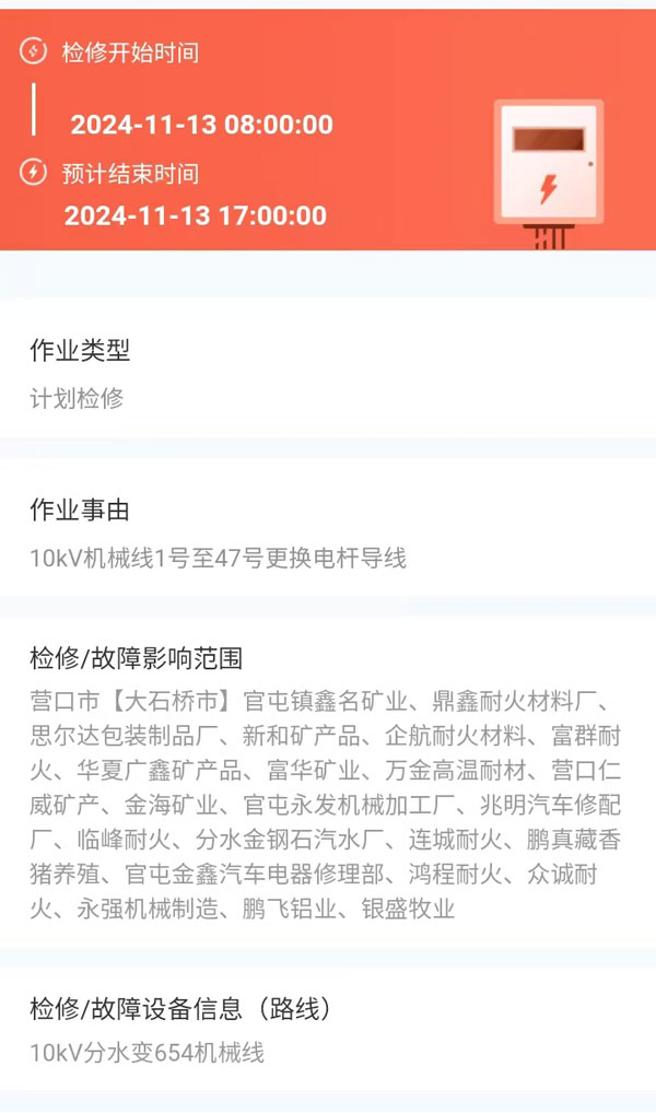2024年11月13日 大石橋市電網(wǎng)檢修公告 |