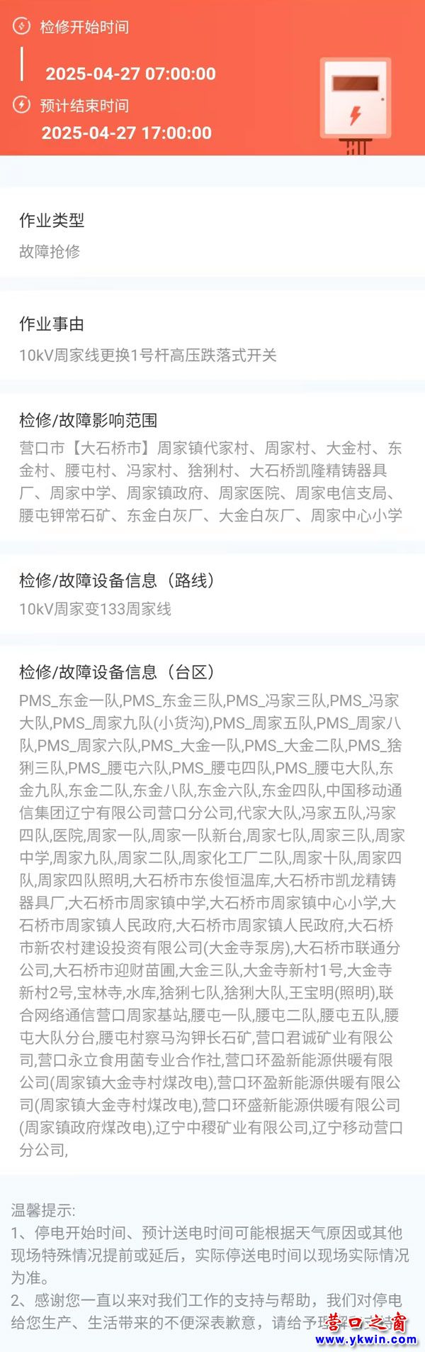 2025年04月27日 大石橋市電網(wǎng)檢修公告 |