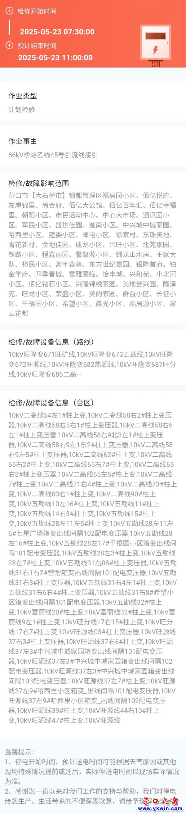 2025年05月23日 大石橋市電網(wǎng)檢修公告 |