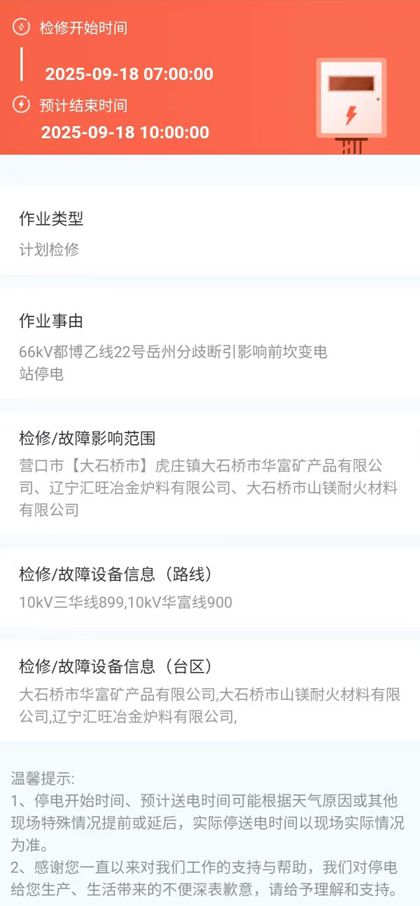 2025年09月18日 大石橋市電網(wǎng)檢修公告 |