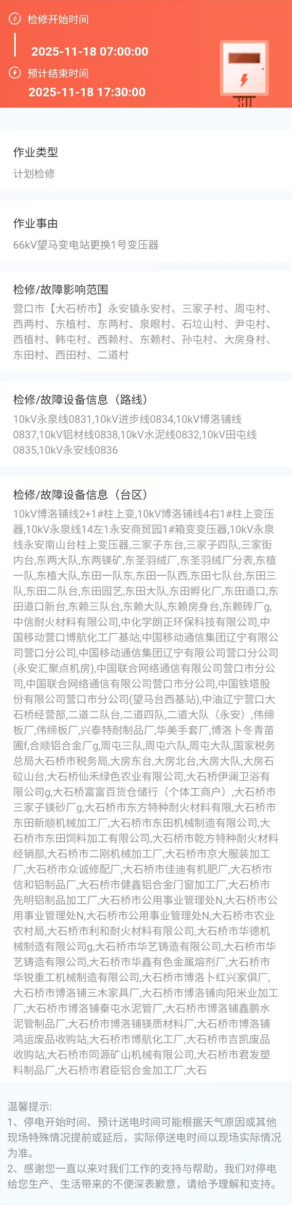 2025年11月18日 大石橋市電網(wǎng)檢修公告 |