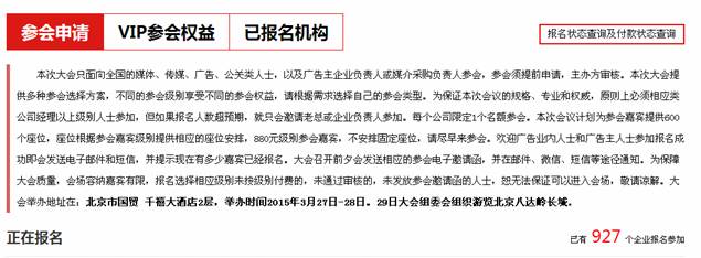 中國廣告業(yè)大會舉辦地:北京國貿(mào) 千禧大酒店 舉辦時間:2015年3月27日-28日 會議人數(shù):600個座位。目前報名企業(yè)已達(dá)927家單位。