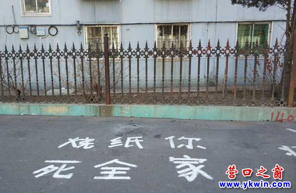 今早,網(wǎng)友路過(guò)營(yíng)口市小雨園小區(qū)北門人行道,赫然發(fā)現(xiàn)用白油漆在柏油地面上書寫的“燒紙你死全家”字眼,結(jié)合旁邊之前文字“窗前禁止燒紙”,可以猜測(cè)出,此舉一定是臨道的某小區(qū)業(yè)主所為。