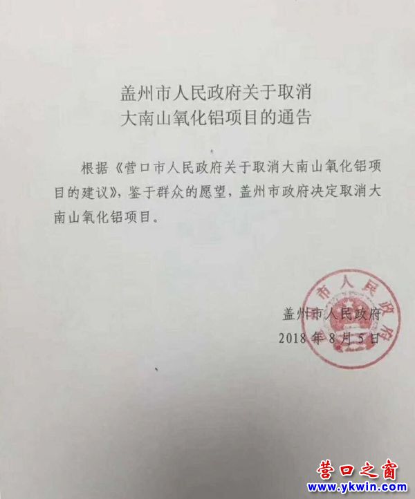 昨晚7點(diǎn)30分,營口市政府新聞辦公室舉行新聞發(fā)布會,就營口廣大市民和網(wǎng)友關(guān)注的大南山氧化鋁項(xiàng)目情況,向新聞媒體進(jìn)行發(fā)布,鑒于群眾的愿望,決定:營口大南山氧化鋁項(xiàng)目取消!