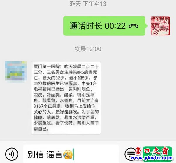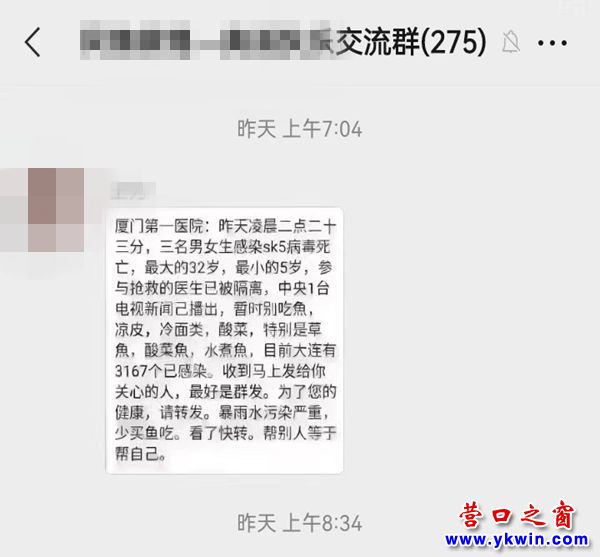 (營口之窗“百姓說事”)昨天,營口朋友圈、微信群瘋傳“廈門有人感染sk5病毒死亡”,稱“廈門第一醫(yī)院:昨天凌晨02:23分,三名男女生感染sk5病毒死亡,最大的32歲,最小的5歲,參與搶救的醫(yī)生已被隔離,中央一臺電視新聞已播出,暫時別吃魚、涼皮、冷面類、酸菜,特別是草魚,酸菜魚、水煮魚,目前大連有3167個已感染,收到馬上發(fā)給你關(guān)心的人,最好是群發(fā)。為了您的健康,請轉(zhuǎn)發(fā)。暴雨水污染嚴(yán)重,少買魚吃。看了快轉(zhuǎn)。幫別人等于幫自己”。乍看確實(shí)挺嚇人,但是這條消息是真的嗎?