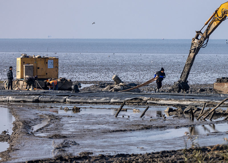 據(jù)施工人員說,這種作業(yè)大都是在寒冬里施工,灘涂地面結(jié)凍后車輛可以穿行拉運材料和土方,雖然施工人員寒冷,吃飯也不方便,但是施工卻方便多了。所以必須搶時間爭取盡快完工,在天暖前,地面還沒解凍時完成固化帶鋪設(shè)。