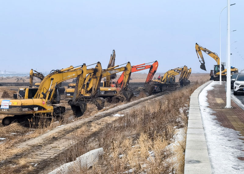 此前我們路經(jīng)這里適遠遠就能聽到機車作業(yè)的轟鳴聲,看到蘆葦深處挖掘機揮動的動臂,當大片蘆葦開割后,在灘涂邊上施工的挖掘機和運輸卡車忙碌的情景才展露出來。