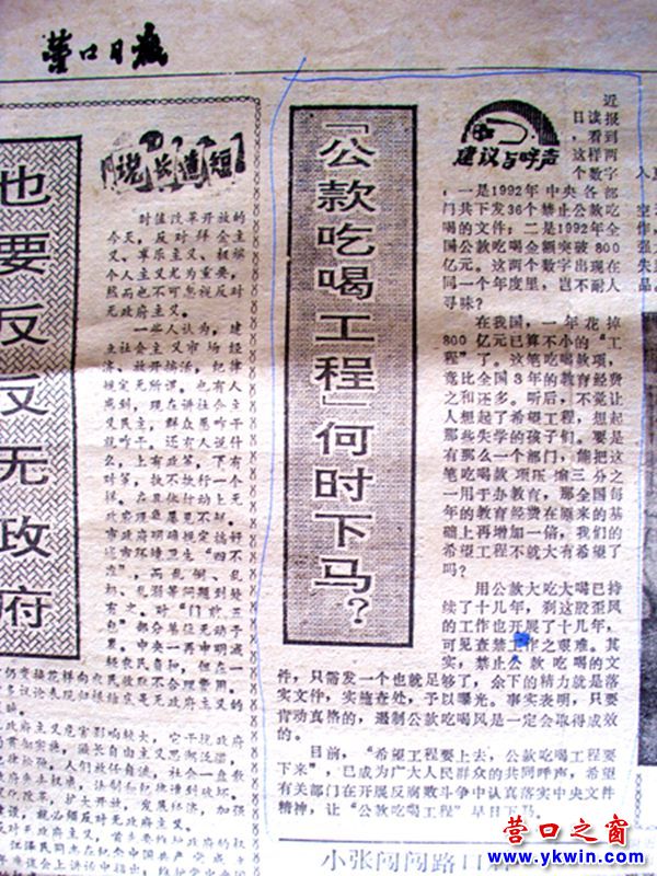 刊登在1993年8月27日的營(yíng)口日?qǐng)?bào)上的《“公款吃喝工程”何時(shí)下馬?》