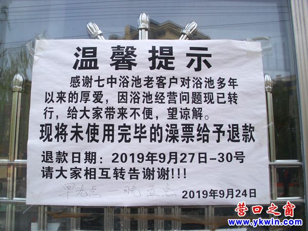 10月9日,從原營口市七中浴池門前經(jīng)過見到其辦公室的門玻璃上貼著一則《溫馨提示》,其大意如下:感謝老客戶多年來對七中浴池的厚愛。因經(jīng)營問題,本浴池現(xiàn)已轉(zhuǎn)行,對于浴客手中剩余的澡票,本浴池自2019年9月27日至9月30日給予全額退款,請大家互相轉(zhuǎn)告,謝謝!