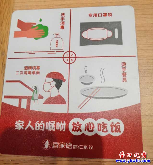 李女士與老伴晚餐時(shí)間,進(jìn)入營口市萬達(dá)廣場(chǎng)內(nèi)的一家“喜家德餃子店”。門前提供了免洗消毒洗手液,進(jìn)入店內(nèi)剛要坐下服務(wù)員又給每人送來了特制的透明塑料袋?原來是在吃飯時(shí)用于收藏口罩的。坐下后,又看到了餐桌上貼著“家人的囑咐”。吃完飯剛要出門,服務(wù)員又送來了擦手濕紙巾。一連串的行為讓兩位老人感動(dòng)了,于是聽說營口之窗網(wǎng)專門給老百姓說事就來了。