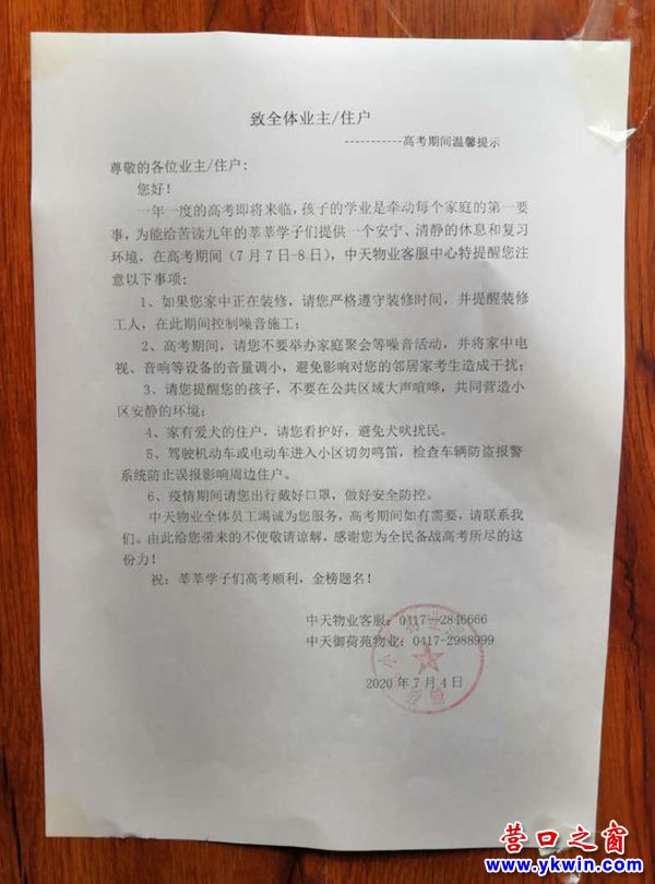 7月4日,營口市中天御荷苑小區(qū)物業(yè)在全小區(qū)的住宅電梯里貼出來告示“致全體業(yè)主高考期間提示”。筆者就住在御荷苑,雖然家里沒有應(yīng)屆考生但是深深的被這個物業(yè)行為感動了。