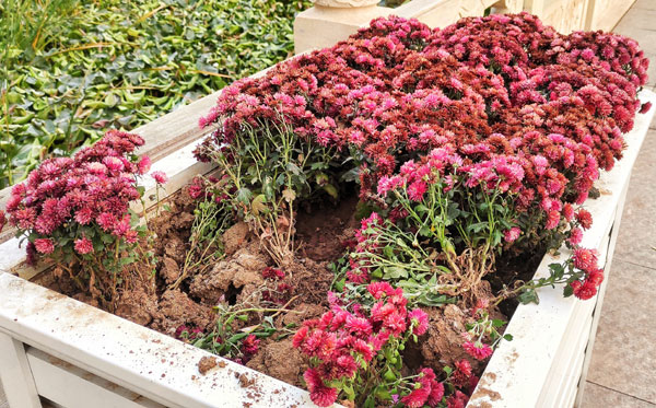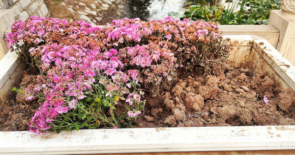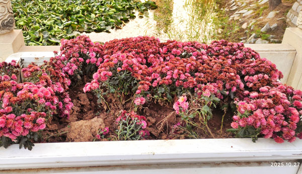 清晨去營(yíng)口市南湖公園,散步賞風(fēng)景。當(dāng)走到南面中央橋上時(shí),只見前些日子公園里的師傅精心栽植的四個(gè)木制花盆里滿盆盛開的菊花,面目全非,有些被人挖走,破爛不堪,大煞風(fēng)景!
