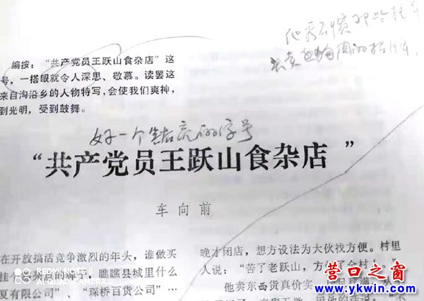 誰(shuí)都不能忘記;80年代初期在中國(guó)大陸農(nóng)村推行的一項(xiàng)重要的改革,是農(nóng)村分田到戶(hù)。當(dāng)時(shí)岀現(xiàn)了“農(nóng)村都分田到戶(hù)了,什么黨員不黨員的”等論調(diào),黨員在農(nóng)村改革大潮中怎樣找到自己的作標(biāo)并引領(lǐng)群眾向前奔? 這時(shí),一篇題為“共產(chǎn)黨員王躍山食雜店”的新聞先后在 營(yíng)口日?qǐng)?bào)、蟠龍山雜志發(fā)表,在全社會(huì)引起廣泛關(guān)注。 遼寧省實(shí)行黨員掛牌服務(wù)始于此文。當(dāng)年省黨校,把這篇文章列為新聞干部培訓(xùn)班教材之一。新聞?dòng)浾哕?chē)向前在此文中推出 不忘初心、牢記使命的踐行者共產(chǎn)黨員王躍山 。這里,摘選幾段文中的動(dòng)人事跡 :