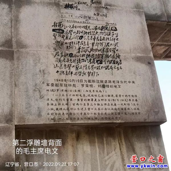 第二座浮雕墻的正面主要刻畫了三個部分:第一部分是清朝末年,營口人民在愛國將領(lǐng)的率領(lǐng)下開展的反帝斗爭。第二部分:是抗日戰(zhàn)爭中的義勇軍以及解放戰(zhàn)爭中營口軍民的戰(zhàn)斗情景。第三部分:刻畫了營口軍民歡慶解放勝利的場面。 在背面,表述了甲午戰(zhàn)爭中的西炮臺之戰(zhàn),西炮臺,田莊臺之戰(zhàn),義和團事跡,抗日義勇軍事跡,中國人民解放軍解放營口。1945年8月日本投降后,營口成為國共兩黨的爭奪要地。雙方在營口交替建立政權(quán),營口經(jīng)歷了國民黨三次攻占營口,中國人民解放軍四次解放營口的軍事斗爭。營口的解放也是遼沈戰(zhàn)役的組成部分。是與毛主席對營口的軍事斗爭高瞻遠矚的戰(zhàn)略部署分不開的。(毛主席的電文見上圖)據(jù)有關(guān)資料記載,在3年的解放營口的戰(zhàn)爭中,犧牲在營口地區(qū)的英烈1000余名。他們不朽的名字永遠銘刻在人民心中。 正是: