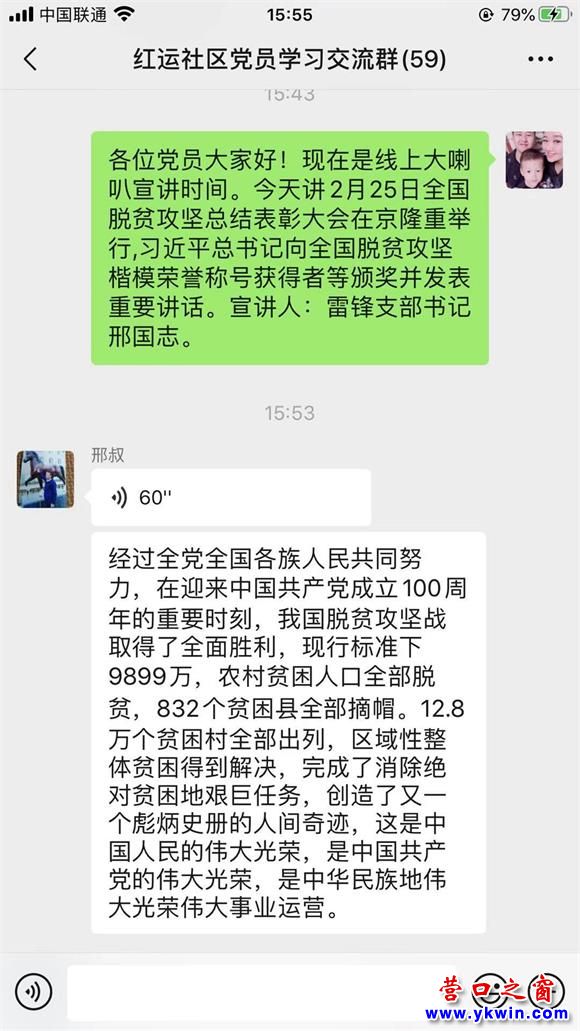 本次宣講員由紅運社區(qū)老黨員邢國志擔任。文章指出,經(jīng)過全黨全國各族人民共同努力,在迎來中國共產黨成立一百周年的重要時刻,我國脫貧攻堅戰(zhàn)取得了全面勝利,現(xiàn)行標準下9899萬農村貧困人口全部脫貧,832個貧困縣全部摘帽,12.8萬個貧困村全部出列,區(qū)域性整體貧困得到解決,完成了消除絕對貧困的艱巨任務,創(chuàng)造了又一個彪炳史冊的人間奇跡!這是中國人民的偉大光榮,是中國共產黨的偉大光榮,是中華民族的偉大光榮。