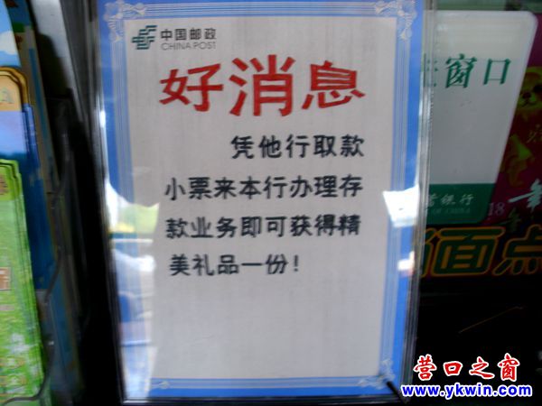 4月30日,來到中國郵政營口某分支機構(gòu)辦理活期存款時在窗口看到一條好消息:憑他行取款小票來本行辦理存款業(yè)務(wù)即可獲得精美禮品一份!我剛從他行取了款又有取款小票又在本行存款完全具備“獲得精美禮品一份”的條件??墒谴嫱昕詈?,該行的工作人員并沒給我精美禮品。于是我問:你們的精美禮品在哪呢?是什么精美禮品?她們的回答是,存一萬元定期的才給禮品呢。我指著窗口的《好消息》反問,那你們是怎么寫的?她們無言以對。