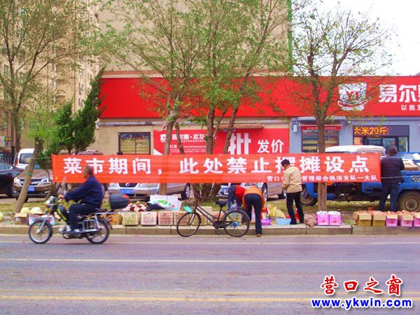 10月20日,營口市大菜市的第一天,在太白路北段出現(xiàn)了令人啼笑皆非的一幕:一條栓在樹上的鮮紅橫幅寫著“菜市期間,此處禁止擺攤設(shè)點”,而橫幅的下面是一排紙箱水果在出售。