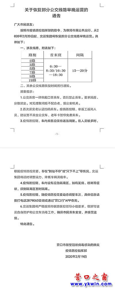 為保障疫情防控期間市民基本公共交通出行需求,按照我市疫情防控指揮部的指令,從2月20日起,營口市將恢復(fù)部分公交車線路,僅限于早晚運(yùn)營。